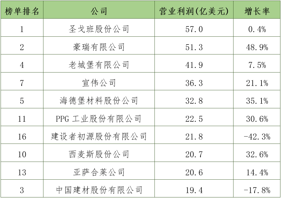 营业利润超过20亿美元的公司共9家,均来自欧洲和北美洲。圣戈班股份公司(法国)以57.0亿美元的营业利润继续领跑上榜公司;豪瑞有限公司(瑞士)和老城堡有限公司(爱尔兰)分列第二和第三。