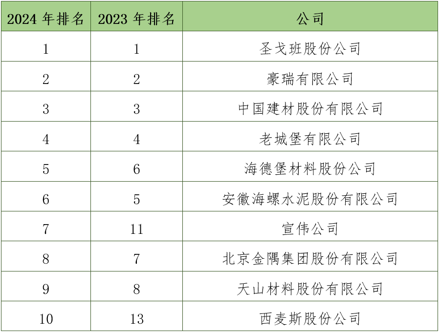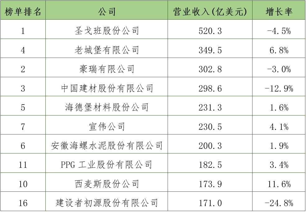 圣戈班股份公司(法国)连续两年居排行榜第一名,营业收入略有下降,其它指标表现出不同程度的增长;豪瑞有限公司(瑞士)凭借出色的成本控制,营业利润实现大幅提升,稳居排行榜第二名;中国建材股份有限公司的营业收入和营业利润有一定程度下降,其它指标相对稳定,排在第三名;老城堡有限公司(爱尔兰)营业利润继续保持增长,排在第四名;海德堡材料股份公司(德国)营业利润和经营性现金流净额都实现两位数增长,升至第五名;西麦斯股份公司(墨西哥)各项指标均实现大幅增长,首次进入排行榜前十。