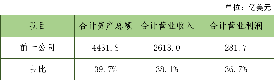 相比2023年排行榜,本次前十名公司的合计资产总额增加3.7%,合计营业收入减少2.2%,合计营业利润增加2.0%。前十名公司的合计资产总额、合计营业收入在百强公司总额中的占比分别增加了2.3个百分点和2.4个百分点,合计营业利润占比则减少了0.8个百分点。